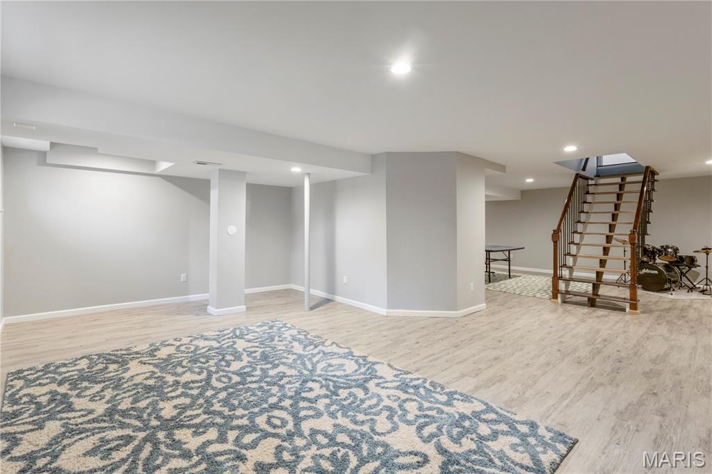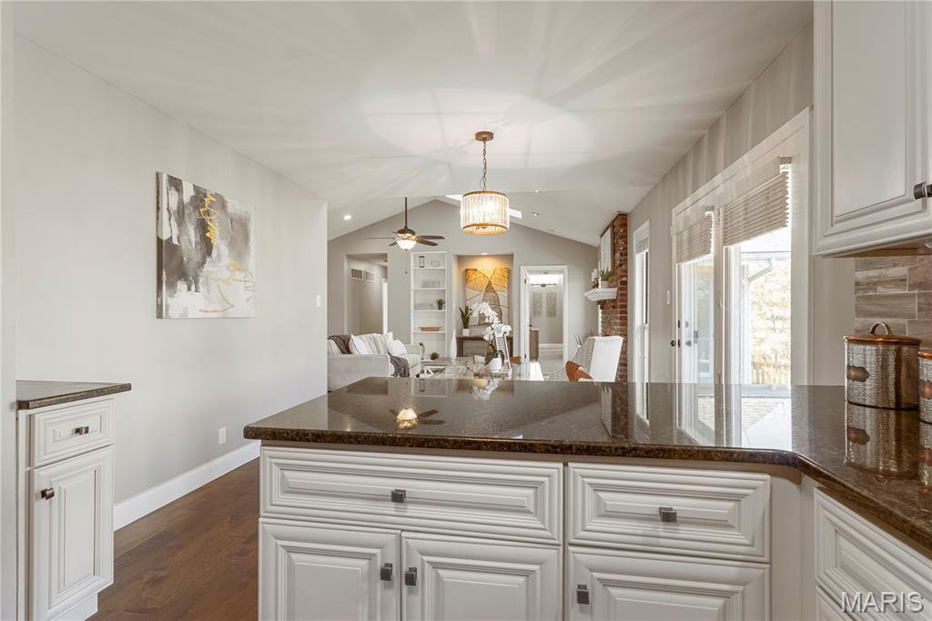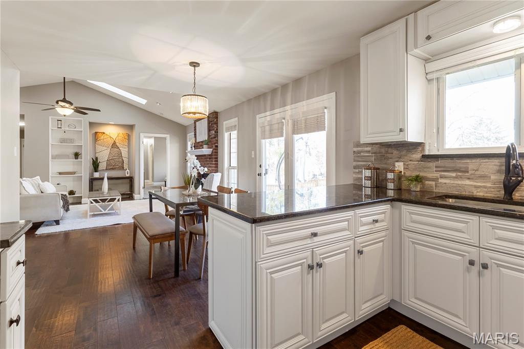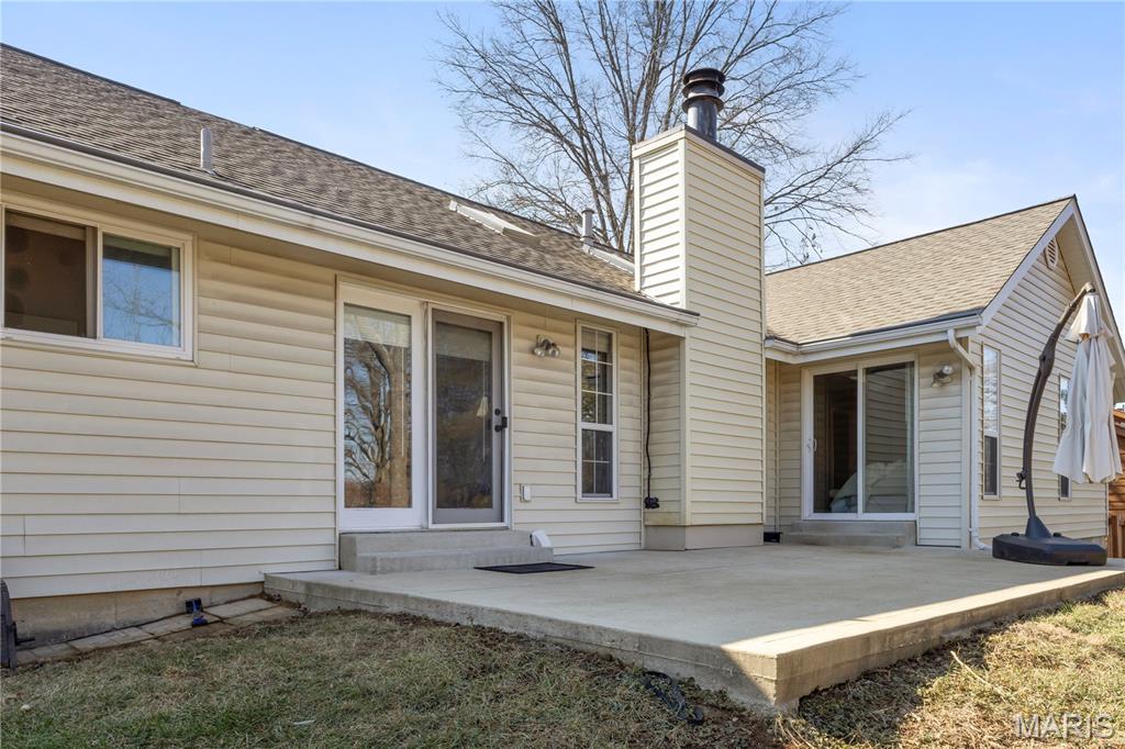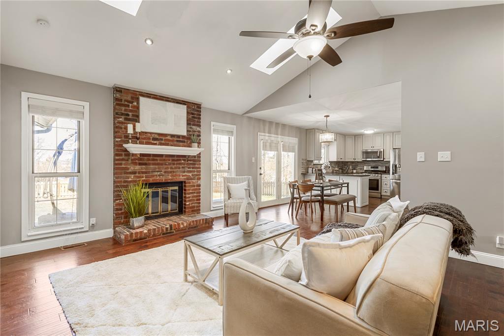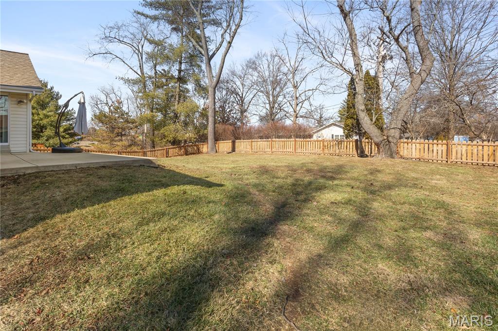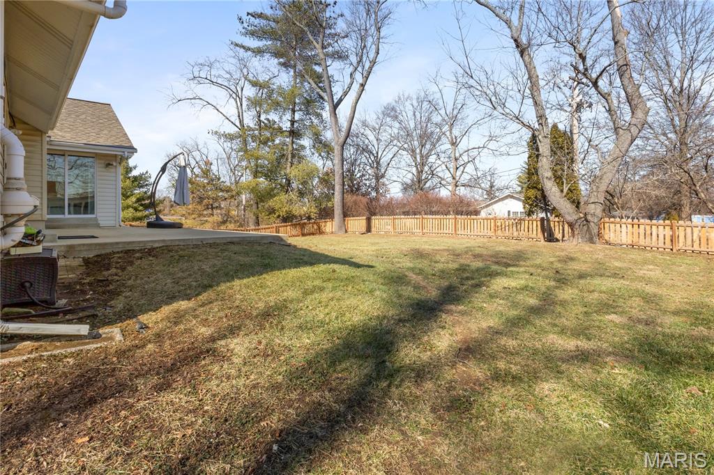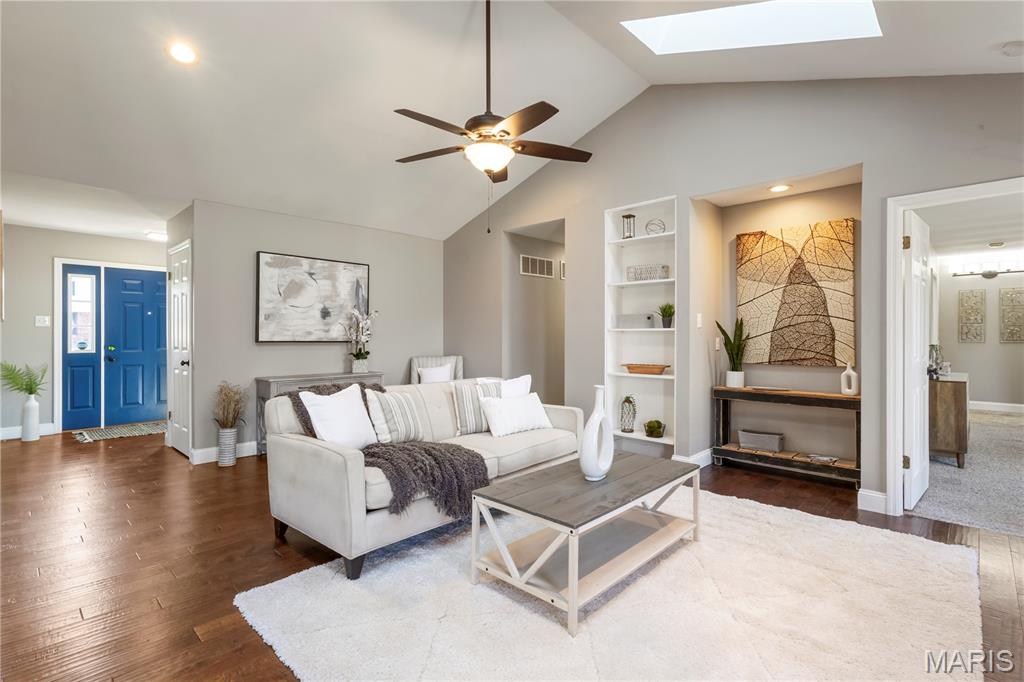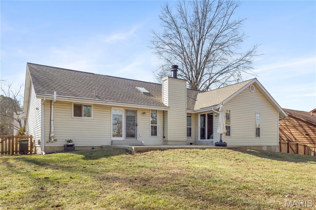 Welcome home to this beautifully updated, and spacious ranch offering an inviting open floor plan designed for comfortable living and easy entertaining. The main level features a Greatroom with vaulted ceilings and skylights that enhance the bright, airy feel throughout the living and dining areas. The well-appointed kitchen was remodeled 7 years ago with granite counters, tile backsplash, deep sink, pantry and stainless appliances including 5 burner gas stove and refrigerator. The kitchen flows seamlessly into the main living space, creating the perfect gathering spot. This home provides 3 bedrooms and 3 full baths, including a convenient main floor laundry room for added ease. The primary bedroom has a separate tub and shower area, huge walk-in closet and sliding doors to the back patio. The finished lower level expands your living space with with a large family room, rec area, full bath, and a versatile den—ideal for a home office, guest space, or hobby room and don't miss the huge closet here. Additional updates and features include brick hearth wood burning fireplace, walk in closets, ceiling fans, beautiful flooring and fixtures, pull out shelving and soft close kitchen cabinets, large patio, 2 car garage, roof and A/C also 7yrs old, and so much more here to see! Refrigerator, washer and dryer stay. Situated on a fenced lot on a quiet cul-de-sac street, this property provides both privacy and minimal traffic. Conveniently located near Highways 141, 64, and 44, with easy access to shopping, dining, and Parkway schools. A wonderful opportunity to enjoy space, comfort, and a prime location all in one! Don't miss this one!