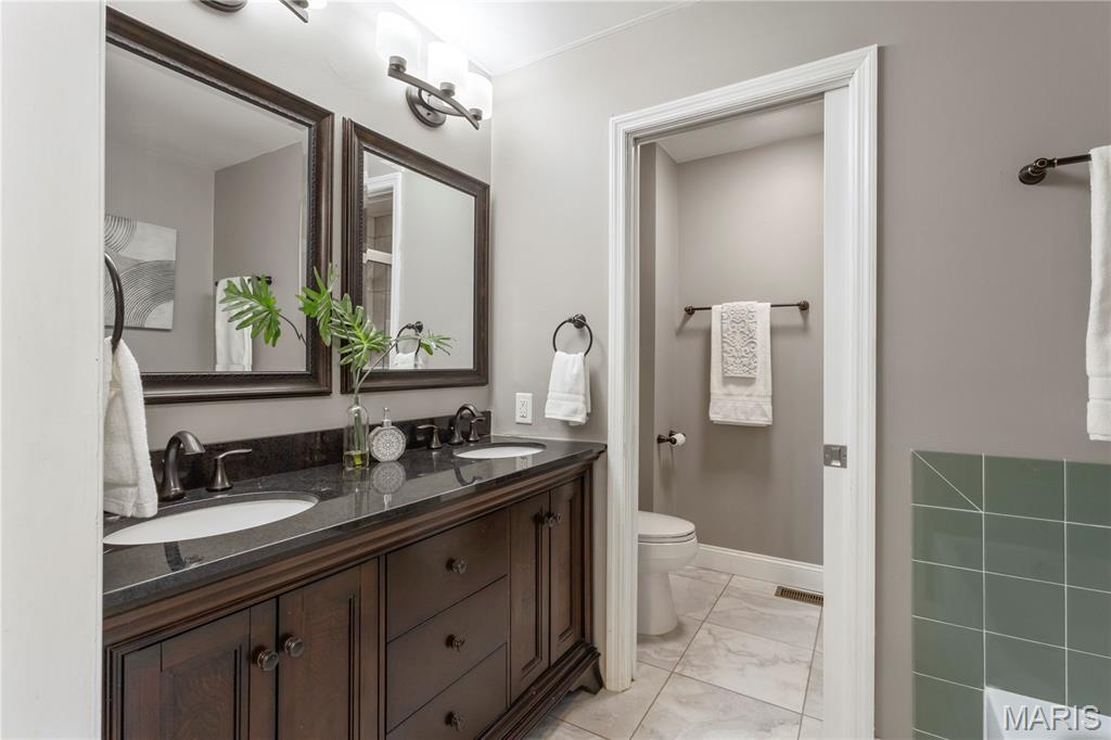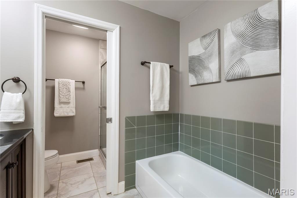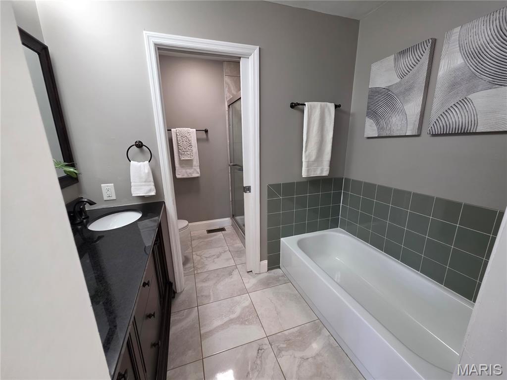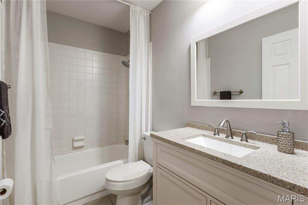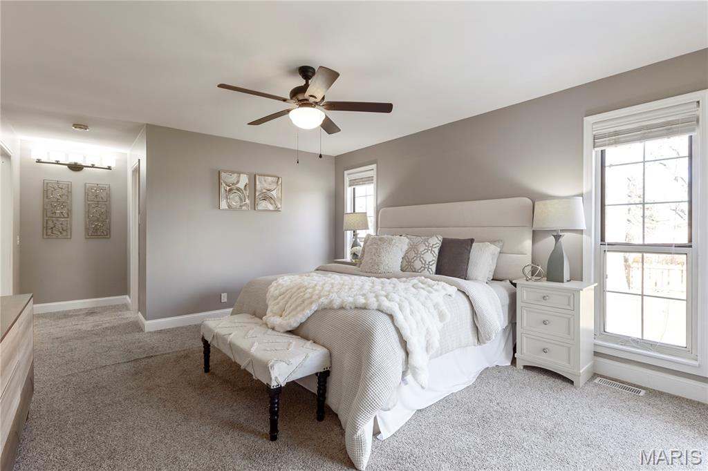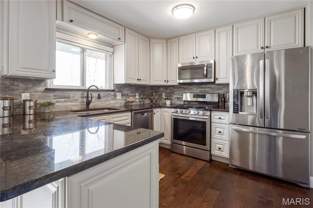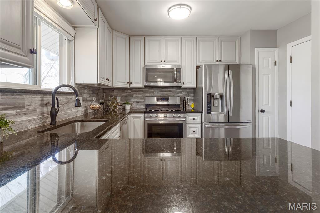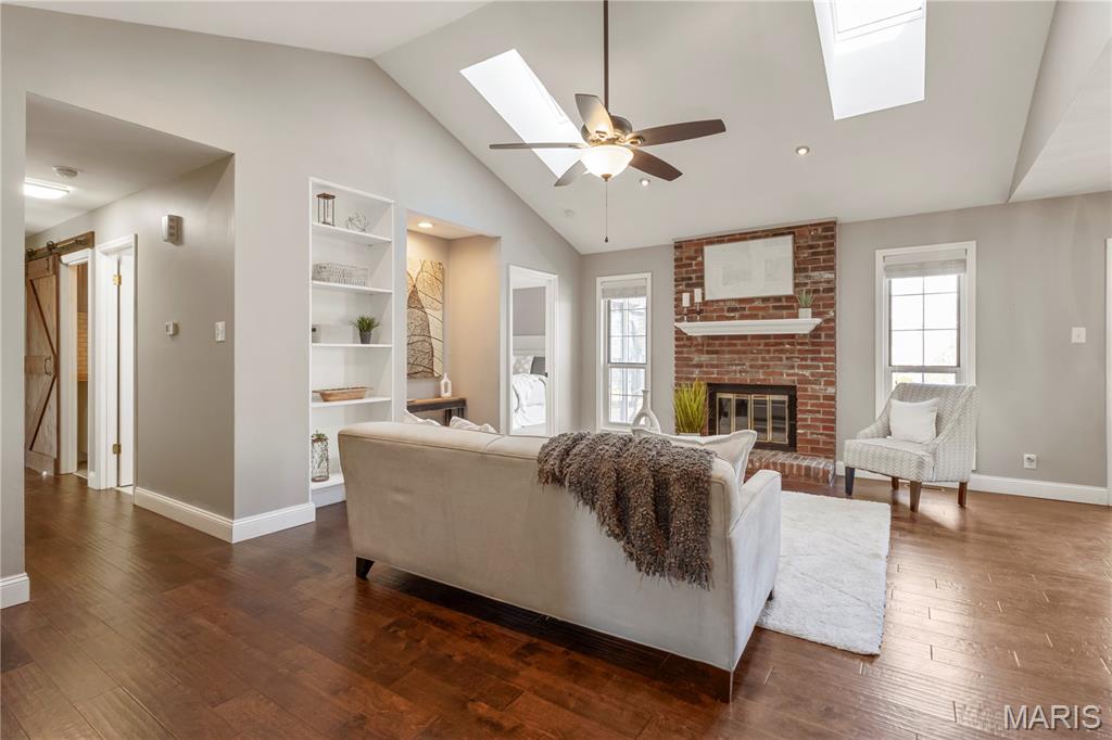 Welcome home to this beautifully updated, and spacious ranch offering an inviting open floor plan designed for comfortable living and easy entertaining. The main level features a Greatroom with vaulted ceilings and skylights that enhance the bright, airy feel throughout the living and dining areas. The well-appointed kitchen was remodeled 7 years ago with granite counters, tile backsplash, deep sink, pantry and stainless appliances including 5 burner gas stove and refrigerator. The kitchen flows seamlessly into the main living space, creating the perfect gathering spot. This home provides 3 bedrooms and 3 full baths, including a convenient main floor laundry room for added ease. The primary bedroom has a separate tub and shower area, huge walk-in closet and sliding doors to the back patio. The finished lower level expands your living space with with a large family room, rec area, full bath, and a versatile den—ideal for a home office, guest space, or hobby room and don't miss the huge closet here. Additional updates and features include brick hearth wood burning fireplace, walk in closets, ceiling fans, beautiful flooring and fixtures, pull out shelving and soft close kitchen cabinets, large patio, 2 car garage, roof and A/C also 7yrs old, and so much more here to see! Refrigerator, washer and dryer stay. Situated on a fenced lot on a quiet cul-de-sac street, this property provides both privacy and minimal traffic. Conveniently located near Highways 141, 64, and 44, with easy access to shopping, dining, and Parkway schools. A wonderful opportunity to enjoy space, comfort, and a prime location all in one! Don't miss this one!
